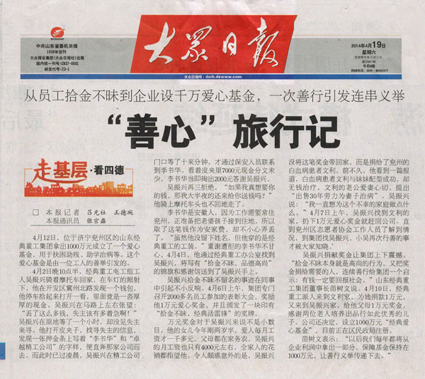 412日,位于濟寧兗州區的山東經典重工集團拿出1000萬成立了一個愛心基金,用于扶困助殘、助學治病等。這個愛心基金是由一位工人的善行義舉引發的。