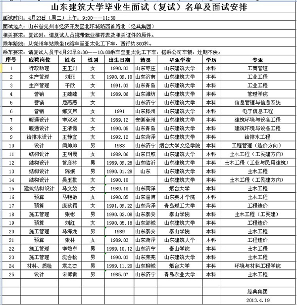 山東建筑大學畢業生面試(復試)名單及面試安排