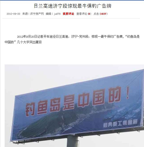 近一段時期以來日本推出了所謂的“購島”無恥行徑,刺激了國人的神經,我們集團作為中華民族大家庭的一員,有責任也有義務保衛我們祖國領土的完整,和不容侵犯,為此集團領導代表集團全體員工通過各種方式彰示了我們的愛國熱情,并付諸于實際行動斥巨資在日蘭高速濟寧段制作了高炮廣告“釣魚島是中國的”以顯示我們保釣之決心。