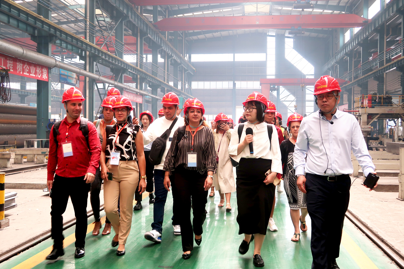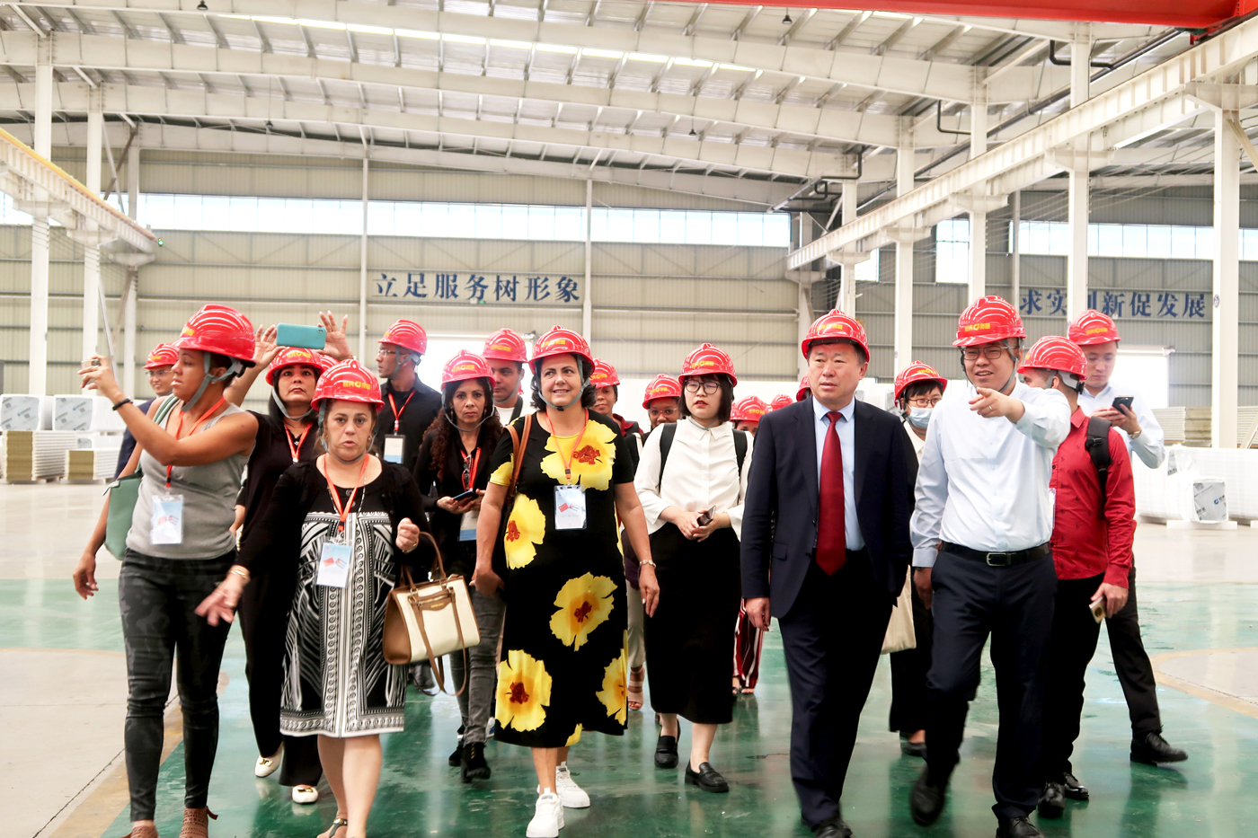 該研修班一行先后參觀了經典集團凱思諾智能化生產線、中冶智能化生產車間以及高端裝配式建筑集成房屋項目等。在座談會上,集團副總經理兼生產總工張琦對研修班學員一行的到來表示熱烈的歡迎,詳細介紹了集團發展歷程、生產經營、企業文化建設等,并就集團產業布局和外貿工作開展情況進行了重點介紹。