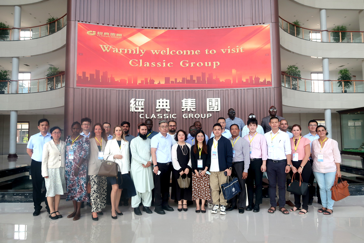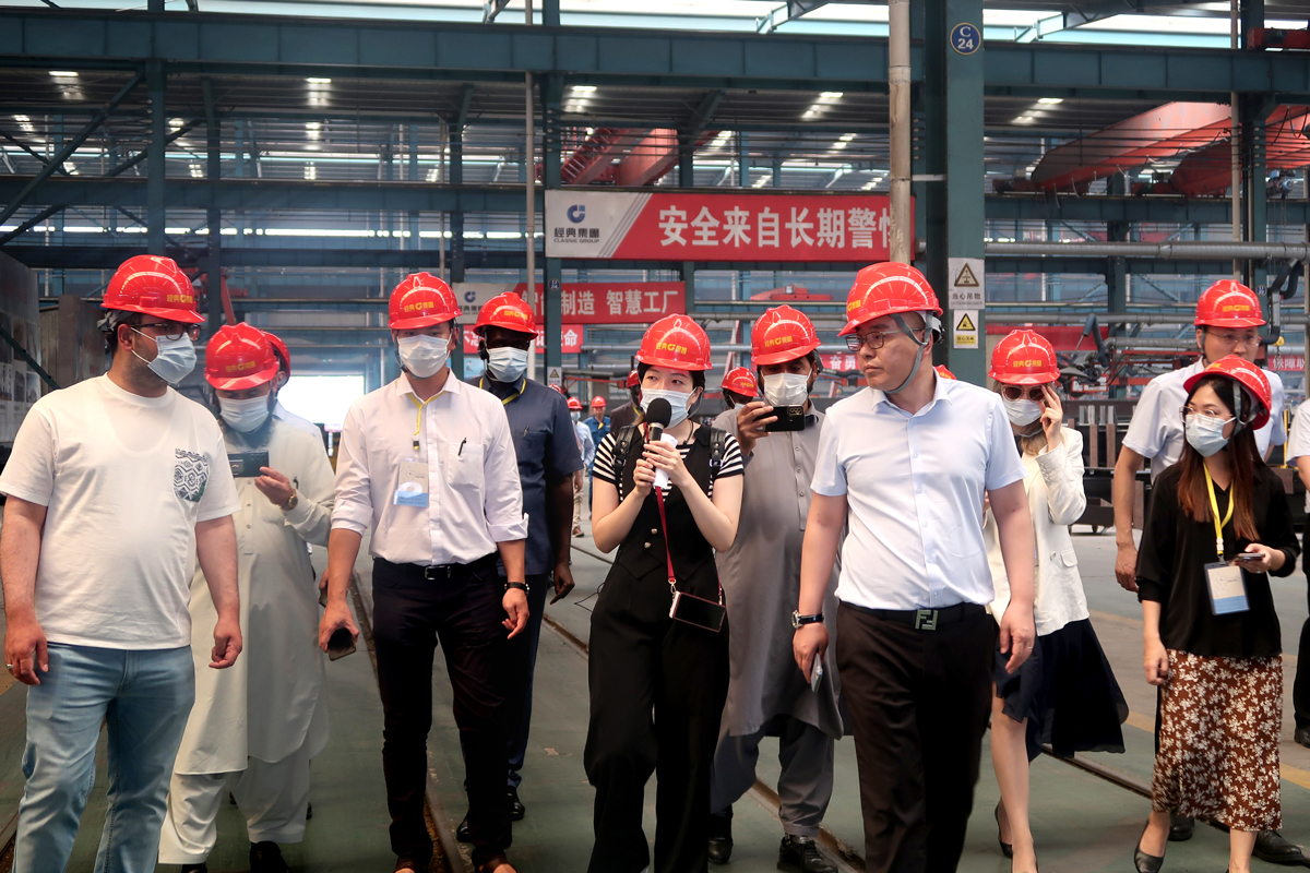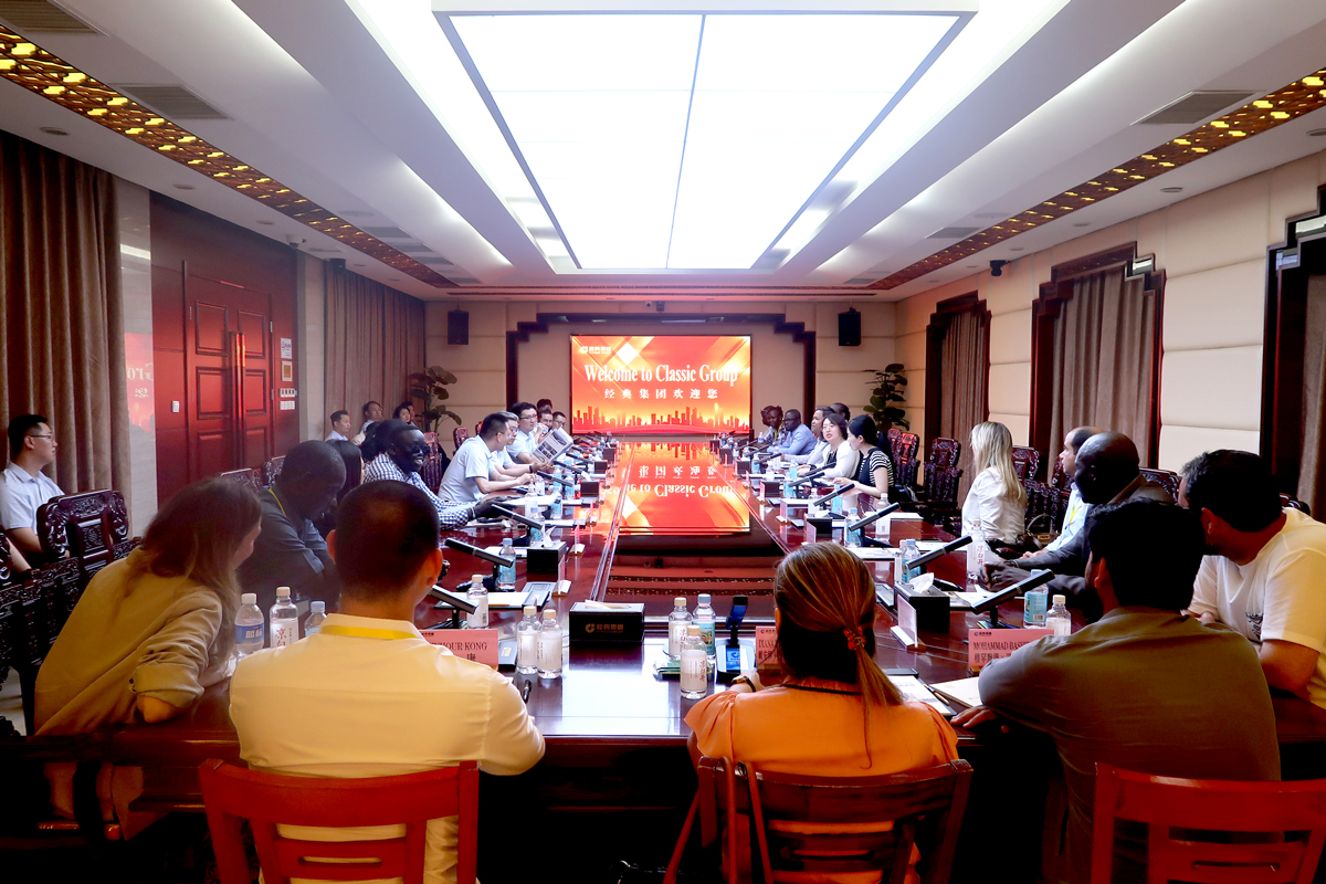 6月11日下午,由商務部主辦、山東外貿職業學院承辦的“發展中國家‘中國經驗-中國社會制度與公共政策’研修班”一行20余人,在山東外貿職業學院援外培訓辦公室主任王保紅的帶隊下,蒞臨經典集團參觀交流。經典集團副總經理兼生產總工張琦、副總經理侯士輝陪同。